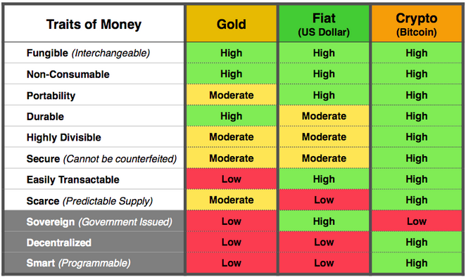 Pozrime sa teraz na porovnanie zlata, fiat peňazí a kryptomien: